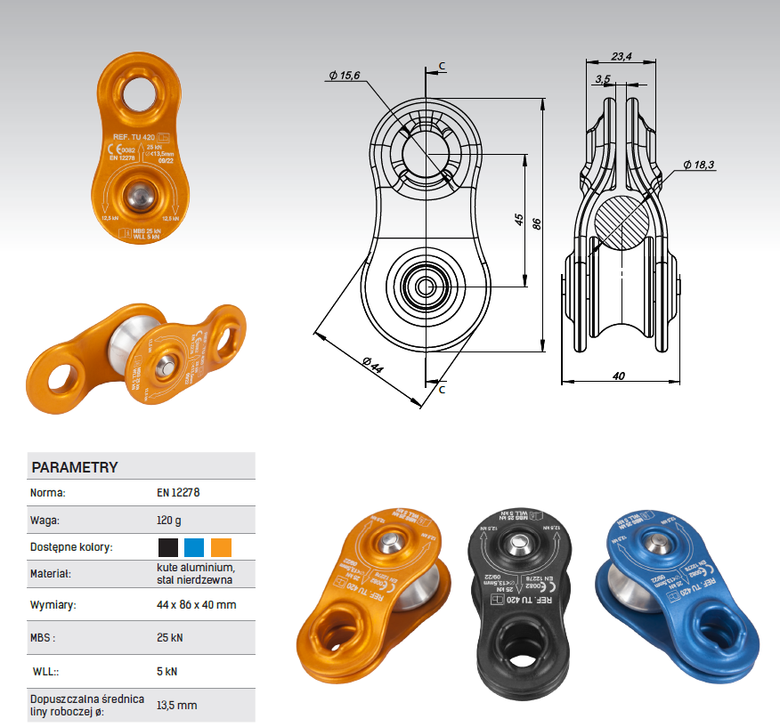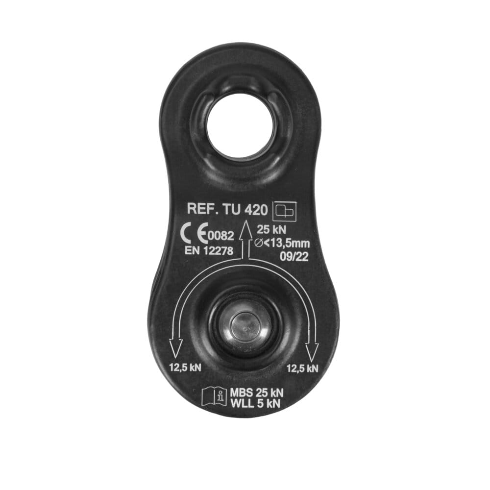 Mini bloczek TU 420 PROTEKT to element sprzętu wspinaczkowego, służący do ułatwienia transportu liny w systemach asekuracyjnych, ratunkowych czy w arborystyce, gdzie konieczne jest przekazywanie obciążenia w pionie lub poziomie. Jest to bloczek (inaczej nazywany rolką), który pozwala na płynniejsze i łatwiejsze przesuwanie liny, zmniejszając tarcie i obciążenie na linie.